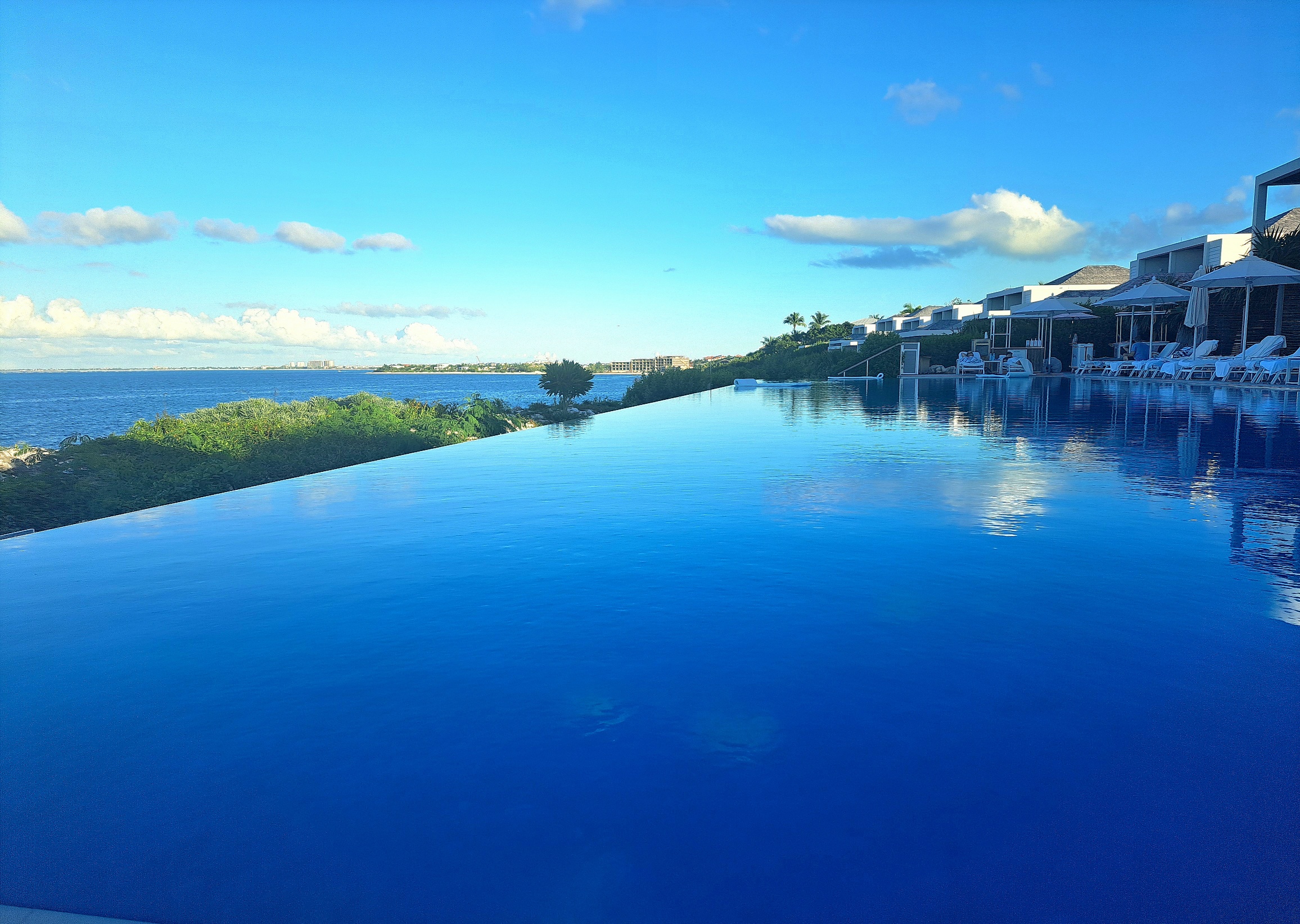 Our room was in the entry level category: an oceanfront studio which was spacious, comfortable and fresh, with a small balcony, a mesmerizing view of the ocean and some much-appreciated amenities, such as fresh water, a Nespresso machine (a blessing for me) and kettle. Décor is in white and blue, with beige accents.